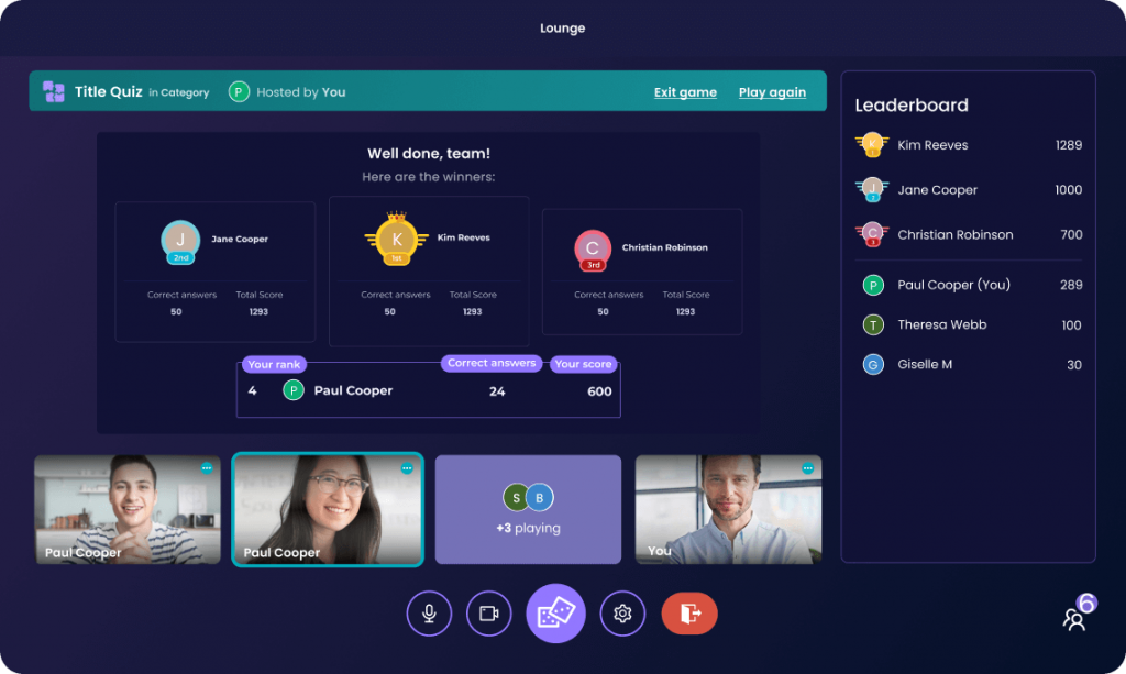 Trivia is a virtual team-building software for employee engagement and fun activities. With Lounge, we are providing a version that allows you to leverage audio and video as well for connecting with employees and building strong teams.