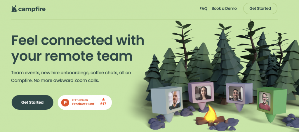 Campfire is a virtual space for employees to have fun while working remotely. It acts as an alternative to rigid zoom calls and allows employees to unwind with their teammates.