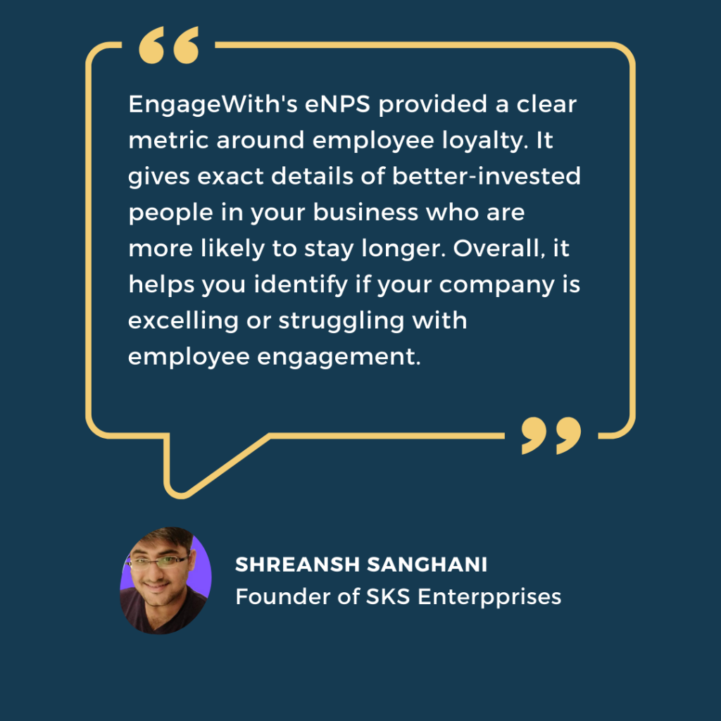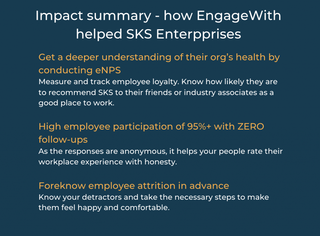 EngageWith’s eNPS is an extremely powerful tool at SKS Enterpprises by empowering them to receive feedback on what employees think about the company.