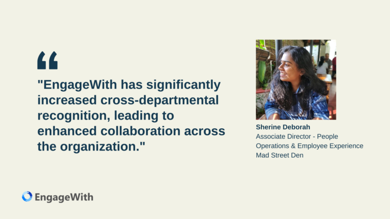 “We’re thrilled with EngageWith and the power of immediate recognition. It’s heartening to see our team appreciating each other through Kudos and Shoutouts. The recognition serves as a reminder that your hard work is noticed and valued. It not only boosts employee morale but also contributes to a vibrant culture,” says Sherine Deborah, Associate Director – People Operations & Employee Experience.