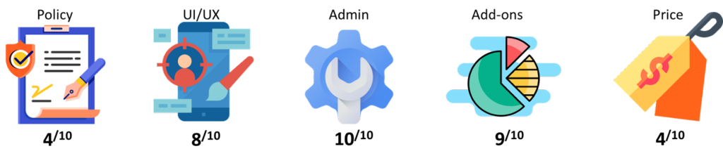 Within each category, we’ve also identified several broad categories of optimization that may help you winnow further, and scored each out of 10: policy flexibility, UI seamlessness, administrative robustness, add-on potential, and price.