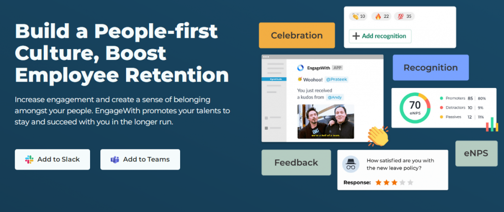 EngageWith is an employee engagement app for Slack and Microsoft Teams. It helps in building a people-first culture through its various tools for your employees to stay and succeed with organizations for a longer time.