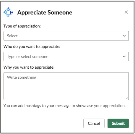 Install EngageWith to your Slack Workspace. Use “/spring” slash command allows any user in your team to send recognition to team members.