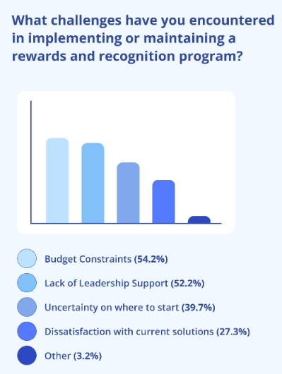 - Budgetary Limitations: A considerable 54.2% of HR professionals identify budget constraints as a hurdle. HR leaders can counteract this by presenting a case for the ROI of recognition programs. This includes outlining the long-term financial benefits such as lower turnover rates.
