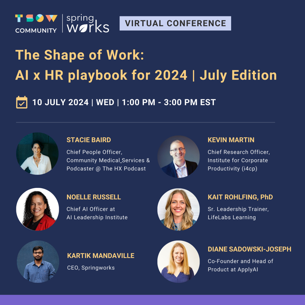 The Shape of Work: AI x HR Playbook 2024 is a dynamic mini-conference series designed to educate and unite HR leaders in exploring how AI is changing the world of HR and the future of work. This event offers a rich blend of engaging panel discussions, expert-led educational sessions, and interactive workshops, making it an essential gathering for HR professionals eager to stay ahead of the curve.