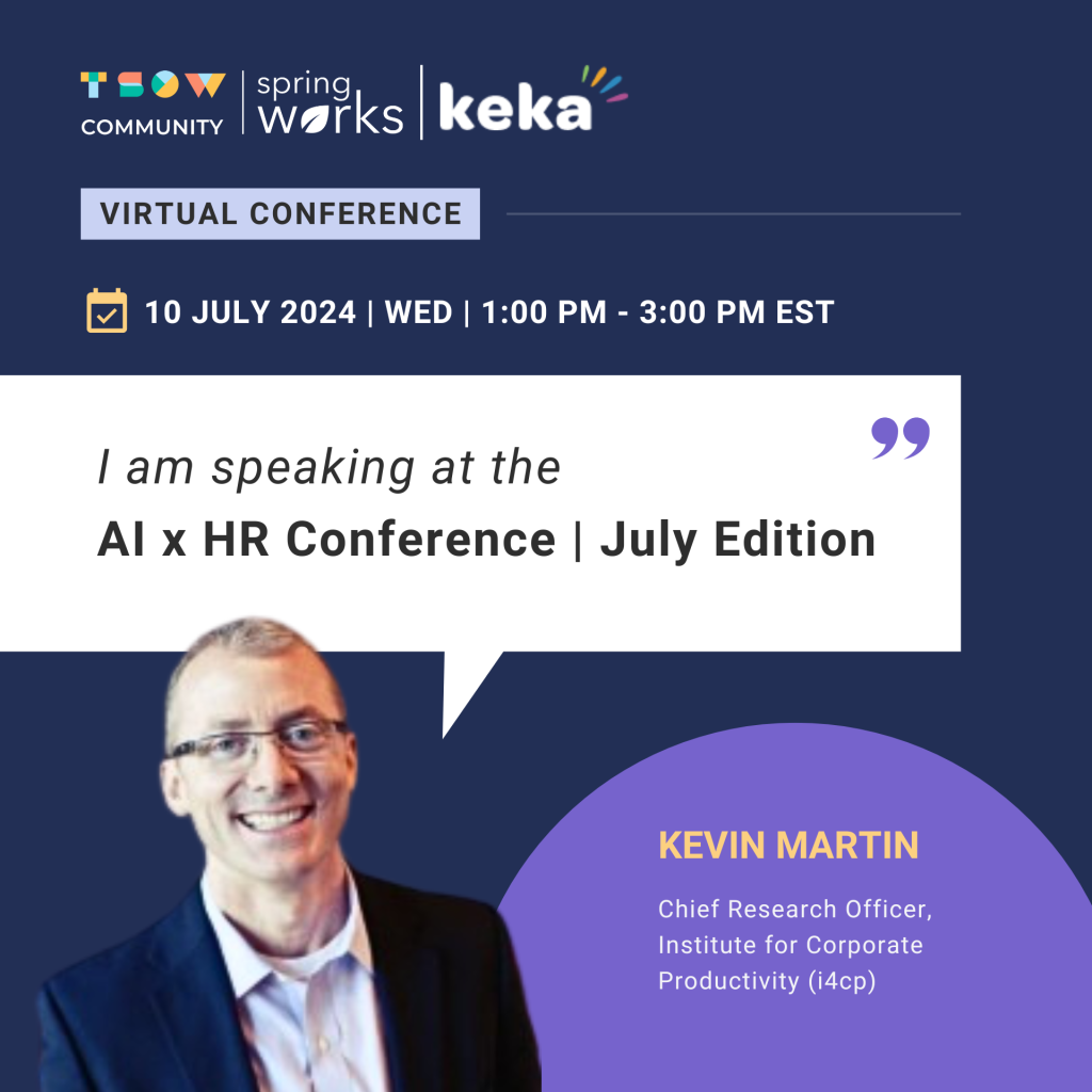 Kevin Martin is the Chief Research Officer at Institute for Corporate Productivity (i4cp), a leading global human capital research firm. Kevin advises HR leaders and corporate boards on topics such as the future of work, people strategy, and leadership effectiveness, and has been recognized as a top HR and HR Tech influencer multiple times. His research is featured in top publications like The Economist, Forbes, and Harvard Business Review.