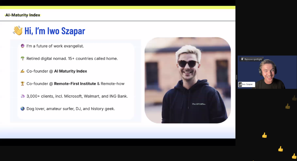 ▶️ For HR professionals, the session provided several actionable insights. First, Iwo emphasized the importance of evaluating AI readiness. By using tools like the AI Maturity Index, HR leaders can understand where their organization stands and what steps are needed to move forward.