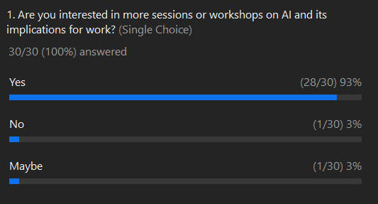 Our poll results further underscored the enthusiasm for continued learning, with 93% of participants expressing interest in more sessions or workshops on AI and its implications for work. Given this overwhelming response, we are excited to announce that we will be organizing more such sessions in the near future.