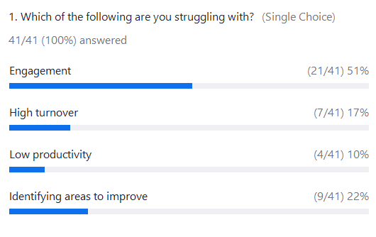 At the beginning of the session, a poll revealed that 51% of attendees were struggling with engagement as their primary challenge, while 22% were facing difficulties identifying areas to improve. High turnover (17%) and low productivity (10%) were also significant issues. These results directly aligned with the topics of the session, setting the stage for a highly relevant and actionable discussion.