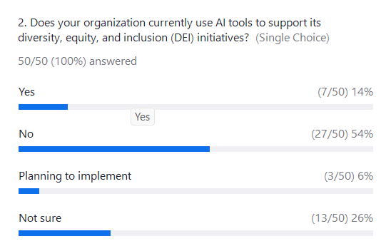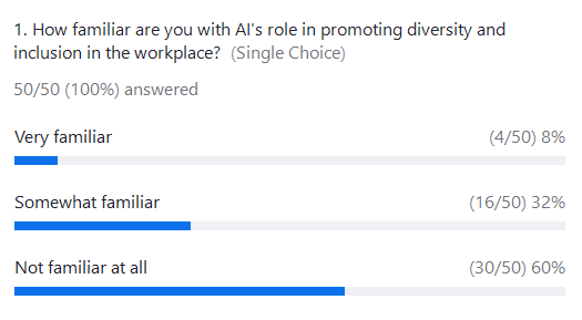 The session’s starting point revealed an interesting challenge. According to a live poll of attendees, 60% were not familiar with AI’s role in promoting diversity and inclusion, while only 8% felt they were very familiar. Additionally, only 14% of organizations represented in the audience were already using AI for DEI initiatives, with over 50% not yet utilizing these tools. This underscored the importance of raising awareness and providing practical examples during the session.